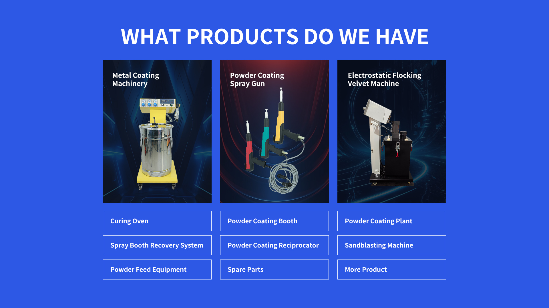 Electrostatic Powder Spraying Equipment uses charged particles to adhere coatings evenly onto surfaces. Core components include a high-voltage electrostatic spray gun, powder hopper, control console, grounding system, and recovery unit.